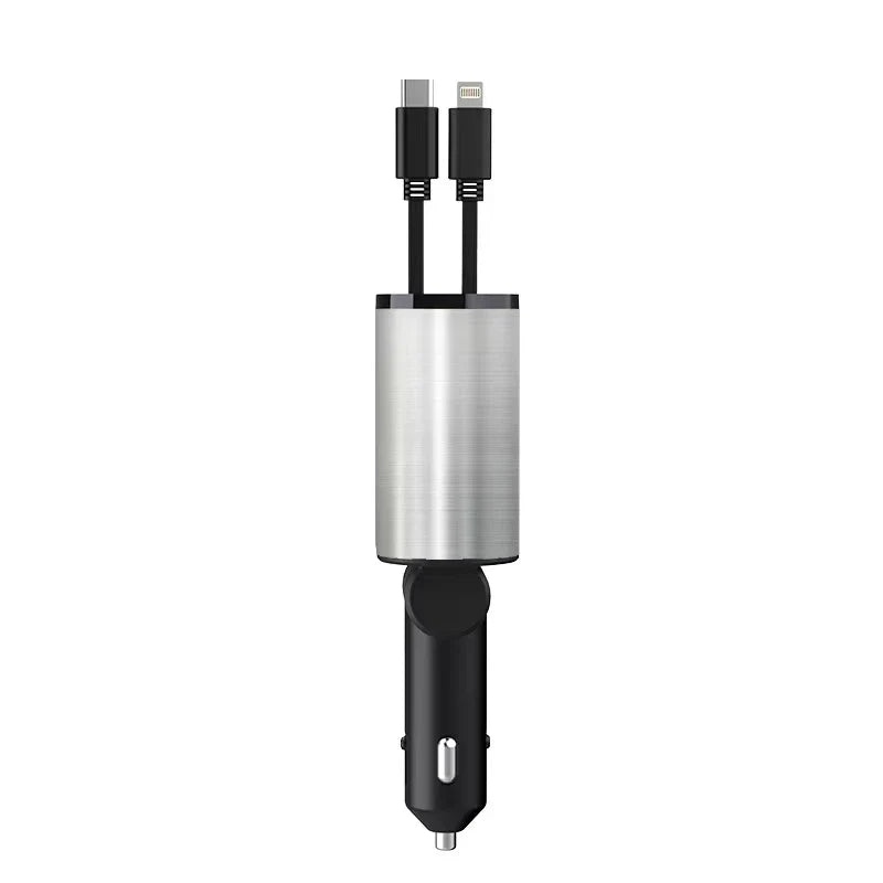 Carregador de carro retrátil 4 em 1 : O tamanho compacto do nosso carregador de carro retrátil 4 em 1 garante que ele ocupa um espaço mínimo em seu carro. Carregue até quatro dispositivos simultaneamente e apoie flexiable que ajusta o ângulo do corpo. O carregador retrátil do carro do telefone caracteriza um projeto retrátil emaranhado-livre engenhoso do cabo que mantenha seus cabos de carregamento organizados e prontos para o uso. O cabo retrátil pode ser puxado para fora até cerca de 80 cm e pode ser automaticamente retraído quando não estiver em uso.